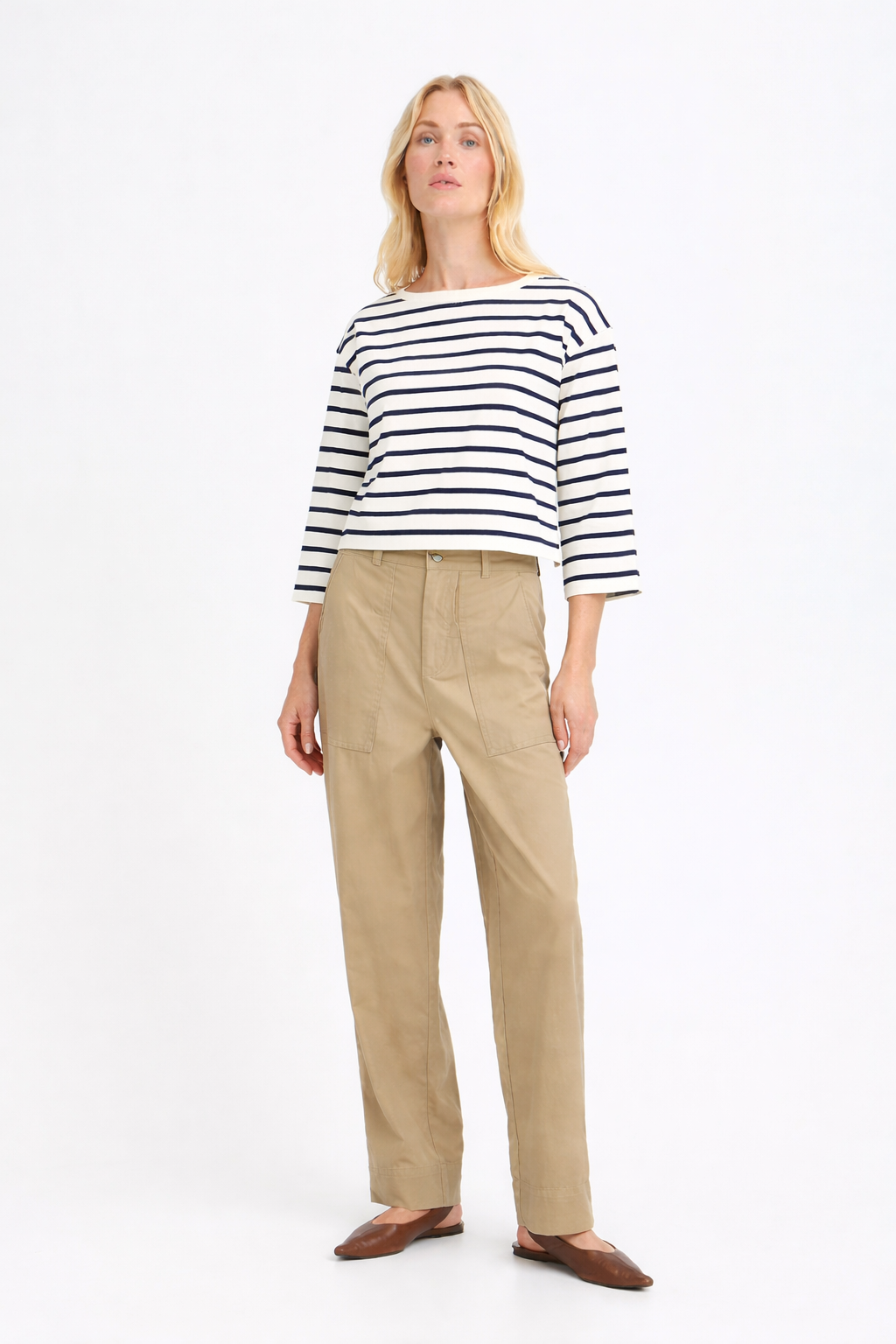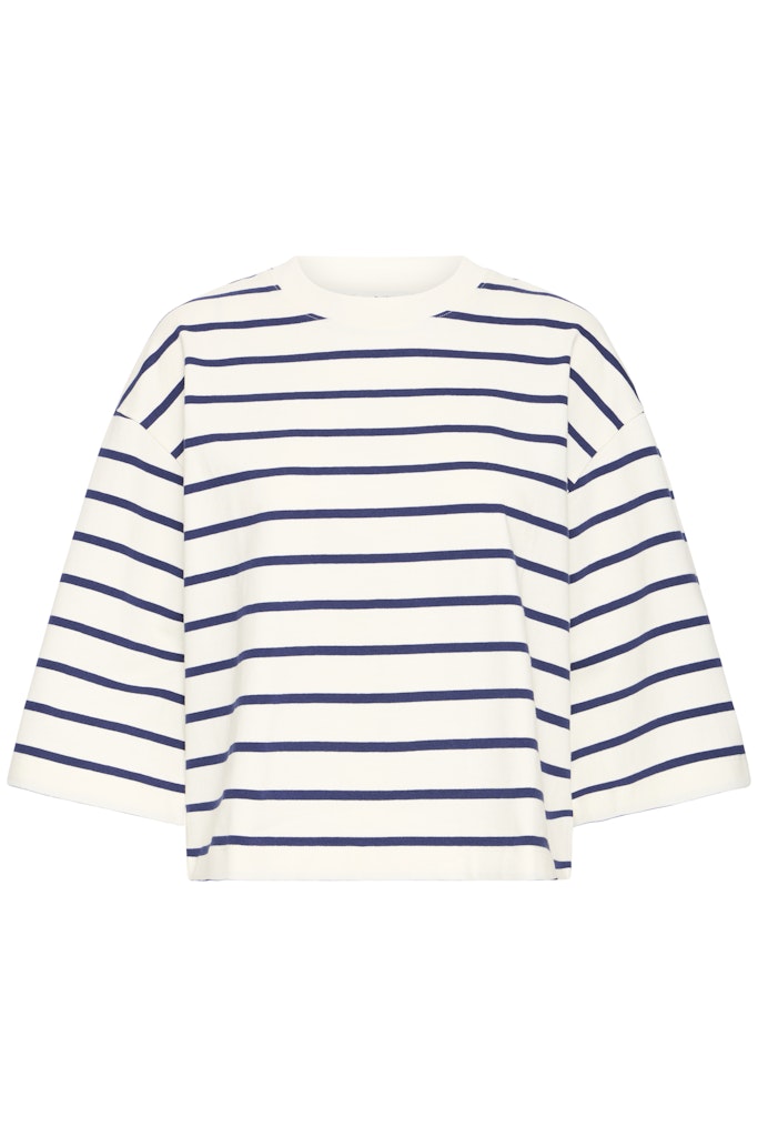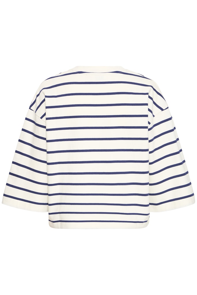 Μπλούζα με μπλε ρίγες και 3/4 μανίκι - το τέλειο κομμάτι για καθημερινές εμφανίσεις! Φτιαγμένη από 100% βαμβακερό ύφασμα για μέγιστη άνεση και αναπνοή. Κοντό μήκος που συνδυάζεται τέλεια με ψηλόμεσα παντελόνια και φούστες.