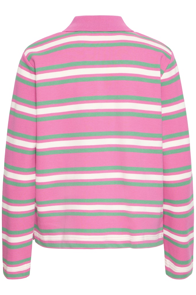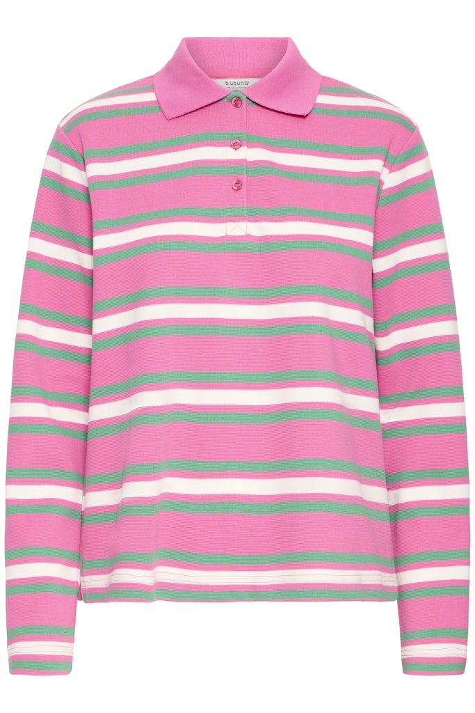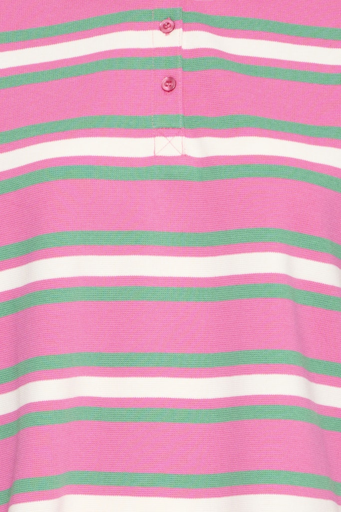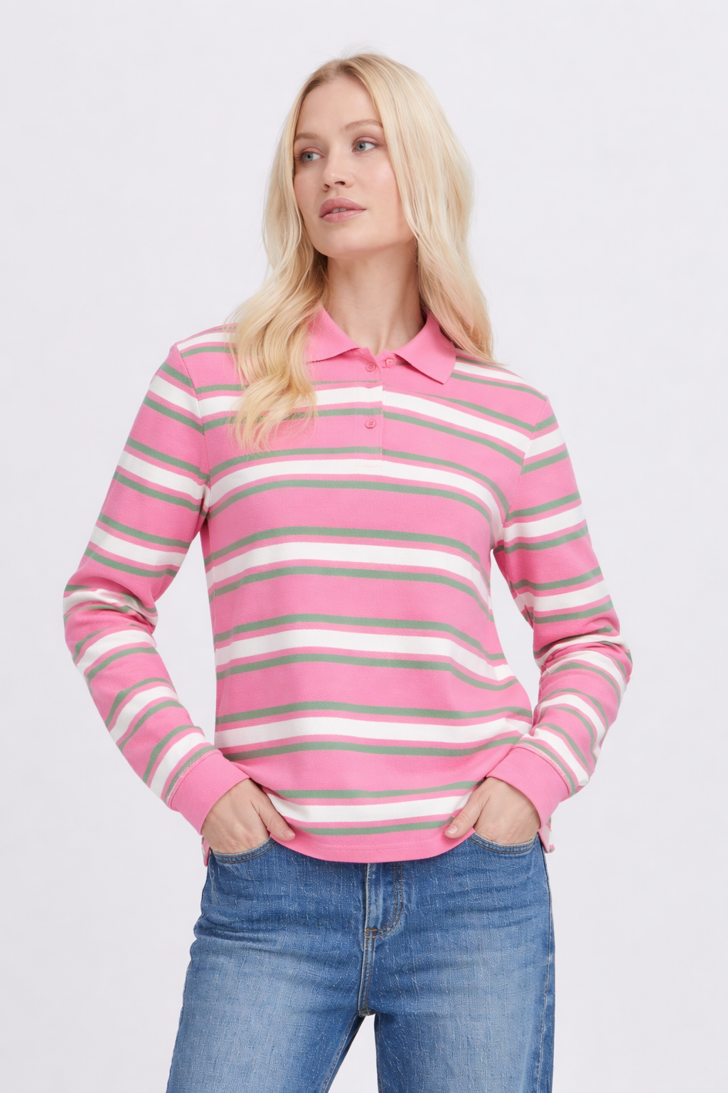 Πολύχρωμο polo με ριγέ που φέρνει την άνοιξη στην γκαρνταρόμπα σου! Οι ζωντανές αποχρώσεις ροζ, πράσινου και λευκού δημιουργούν ένα παιχνιδιάρικο και φρέσκο look. Με κλασικό polo γιακά, κουμπιά και μακριά μανίκια, προσφέρει άνεση και στυλ.