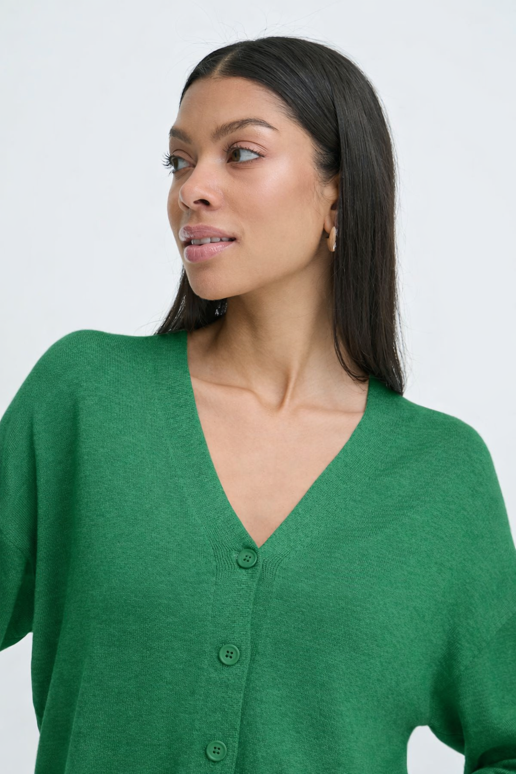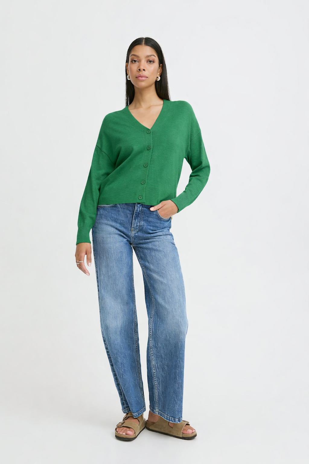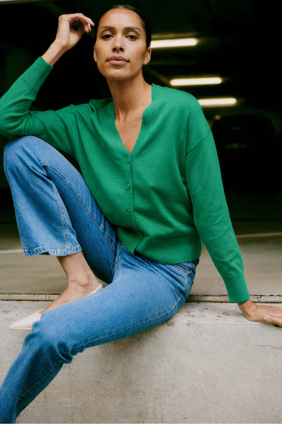 Ζακέτα με κουμπιά σε φαρδιά γραμμή με χαμηλωμένους ώμους και V λαιμόκοψη. Φτάνει στο ύψος του γοφού και έχει απαλή, λεία υφή, με πλατιά ριμπ τελειώματα στα μανίκια και τη μέση.