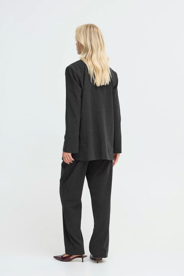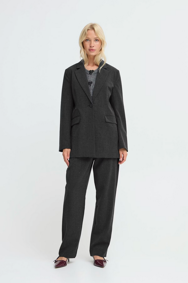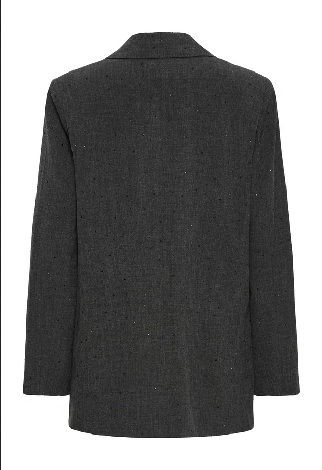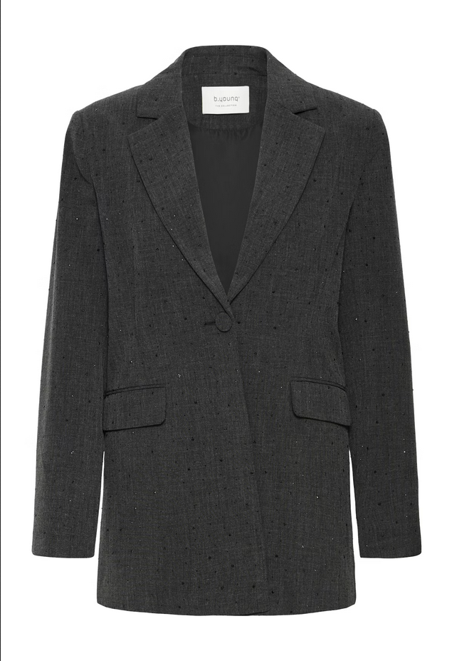 Tailored blazer με λάμψη από την b.young - το statement κομμάτι που κλέβει τις εντυπώσεις! Κλασικό κόψιμο για structured σιλουέτα, notched γιακάς για elegant λεπτομέρεια, κλείσιμο με ένα κουμπί για clean look, διακριτική λάμψη που προσθέτει glamorous αίσθηση, μακριά μανίκια και μπροστινές τσέπες για πρακτικότητα. Το sophisticated blazer που ανεβάζει το workwear και occasion style σε άλλο επίπεδο!