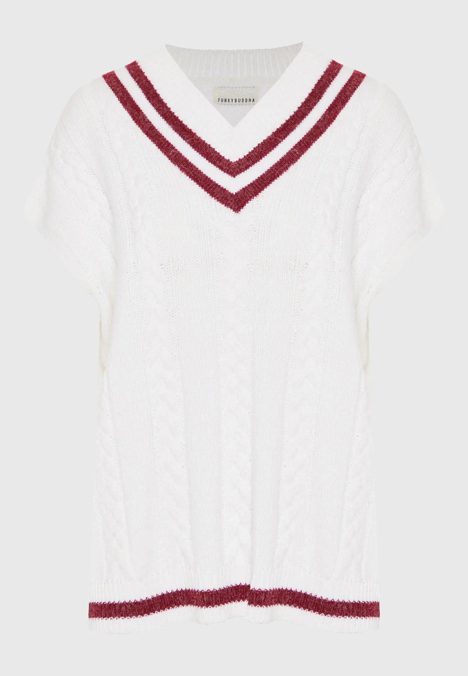 Πλεκτό γιλέκο με V-λαιμόκοψη από την FUNKY BUDDHA - το κλασικό κομμάτι με κολεγιακό χαρακτήρα! Πλέξη κοτσίδα στο μπροστινό μέρος, V-λαιμόκοψη με έντονες ρίγες σε preppy στυλ και ριμπ τελειώματα. Ιδανικό να φορεθεί πάνω από πουκάμισο για μοντέρνο και κομψό varsity look!